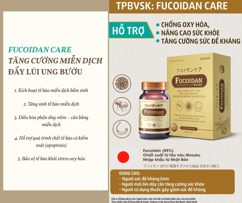 Kế thừa tinh hoa từ người Nhật Bản, Fucoidan Care mang đến giải pháp chăm sóc sức khỏe hiện đại, an toàn và khoa học cho người Việt. Fucoidan Care ra đời trên công thực độc đáo kết hợp Fucoidan 85%, Betaglucan và Đông trùng hạ thảo giúp: